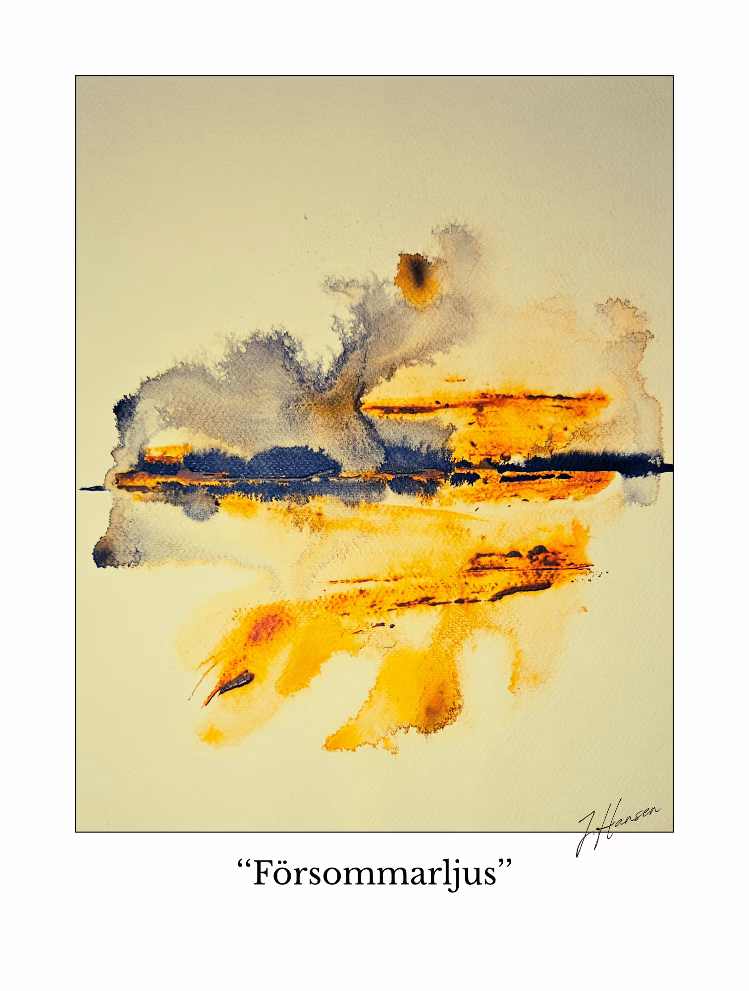 Postern Försommarljus speglar det där gyllene ljuset som bara uppstår under de magiska junikvällarna. Jag ville fånga ögonblicket när solen går ner över vattnet och sjön tycks stå i lågor – ett möte mellan värme och dramatik. Samtidigt drar mörka moln in, och du packar ihop din picknick för att söka skydd i stugan innan regnet faller och naturen vaknar till liv på nytt.